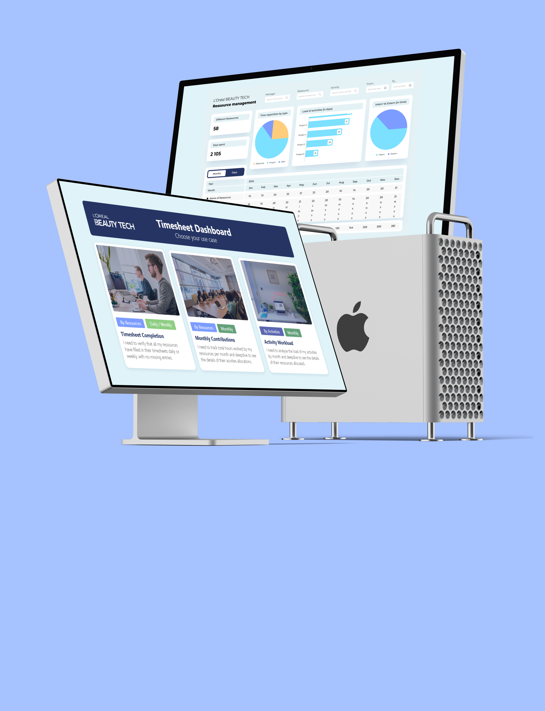 Teams at L’Oréal lacked a unified view of time allocation, with fragmented Excel files and inconsistent reporting. This created inefficiencies, made cross-team comparison difficult, and slowed decision-making. The challenge was to design a solution that simplified access to data while aligning diverse stakeholders across regions.